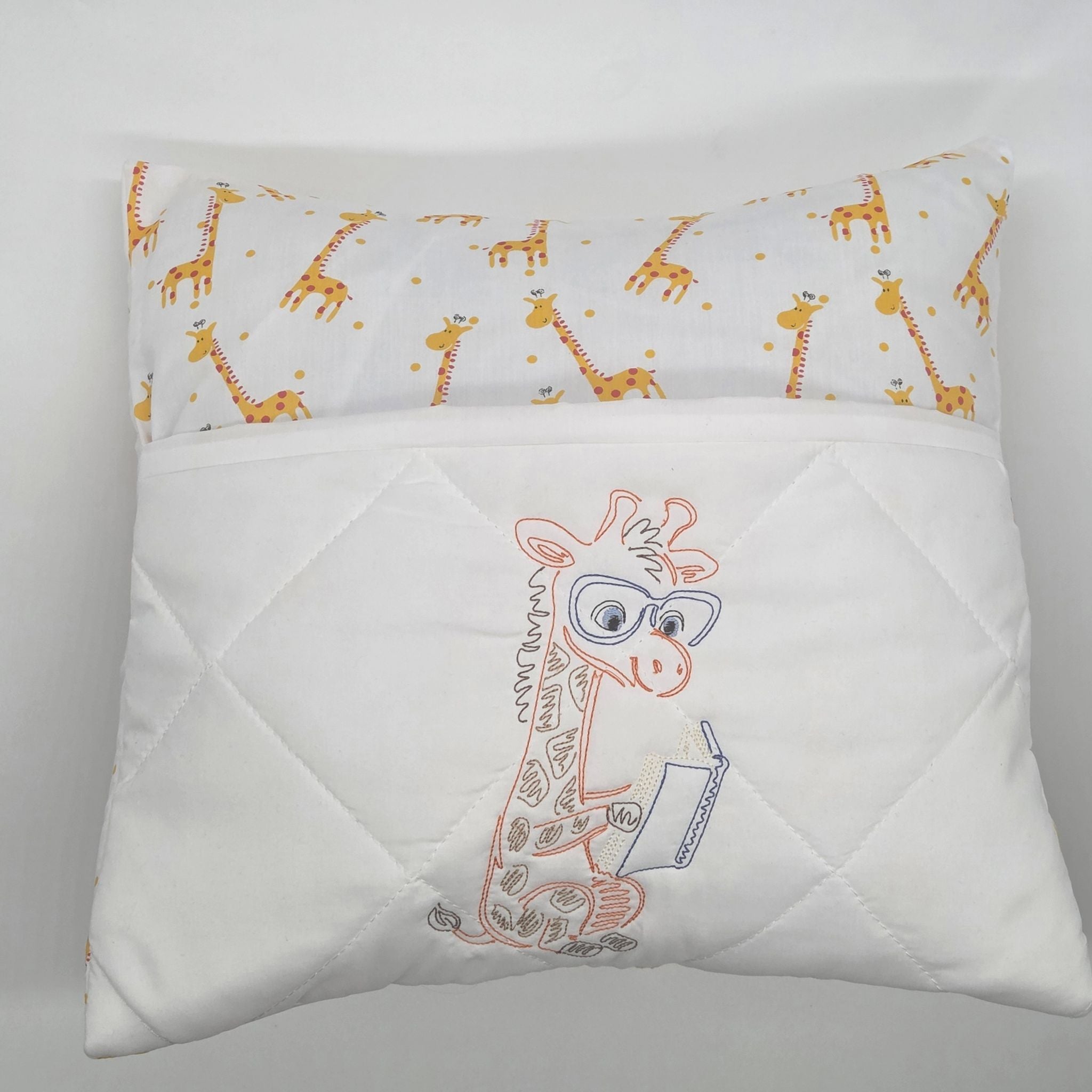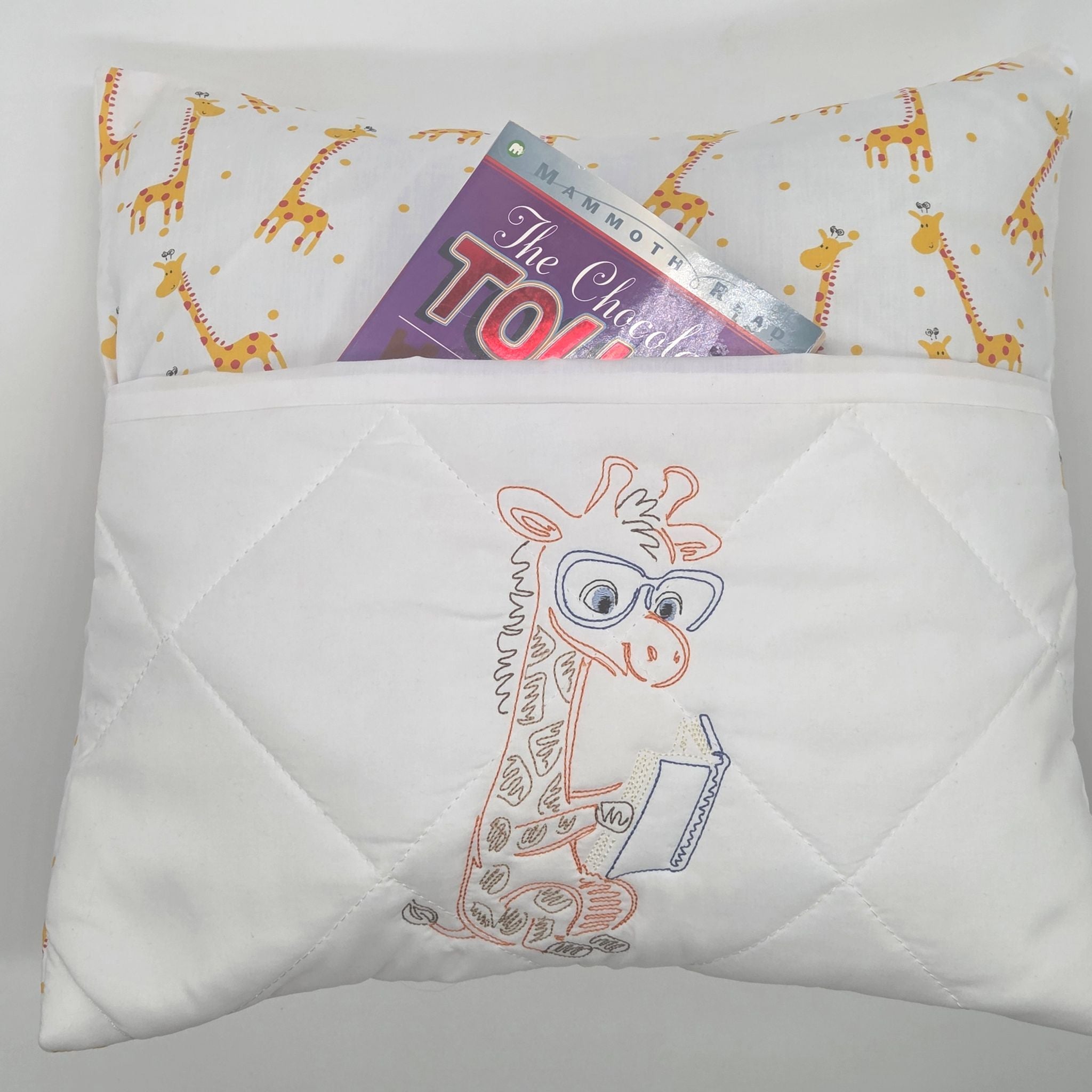 This one features a giraffe reading a book hand embroidered onto the white quilted book pocket.
