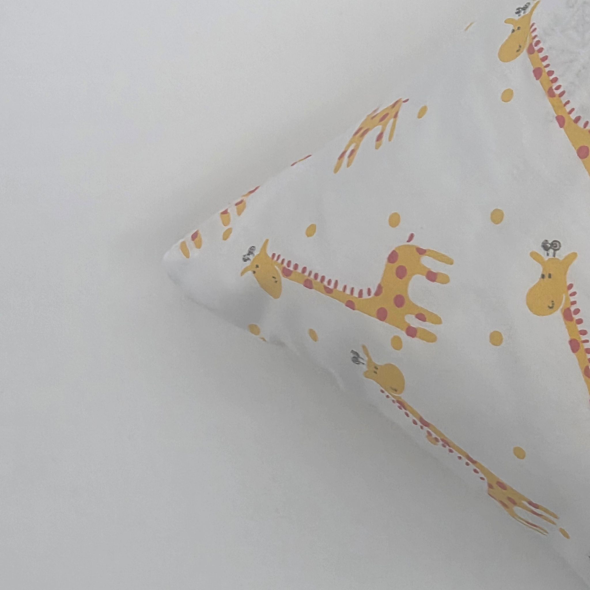The front and rear of the reading cushion features yellow giraffes on a white cotton fabric.