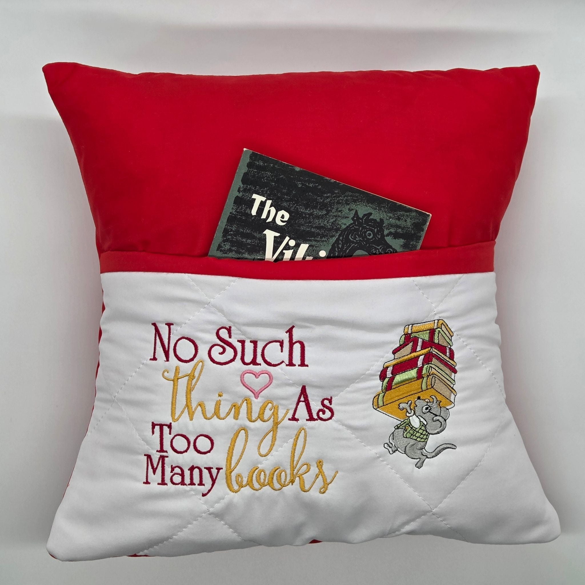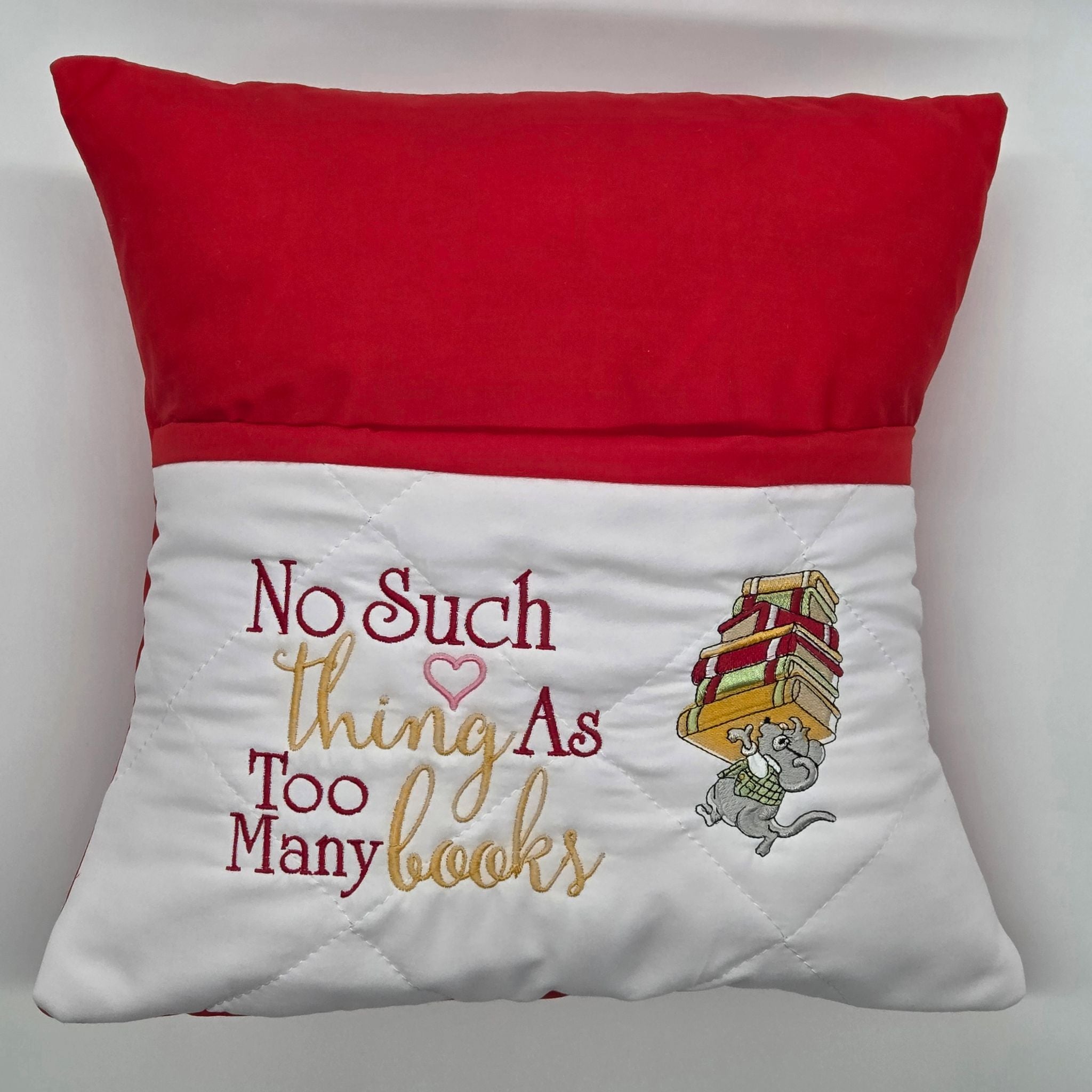 The white quilted pocket to slot a book in features an embroidered cartoon mouse struggling with a pile of books next to the words "no such thing as too many books".