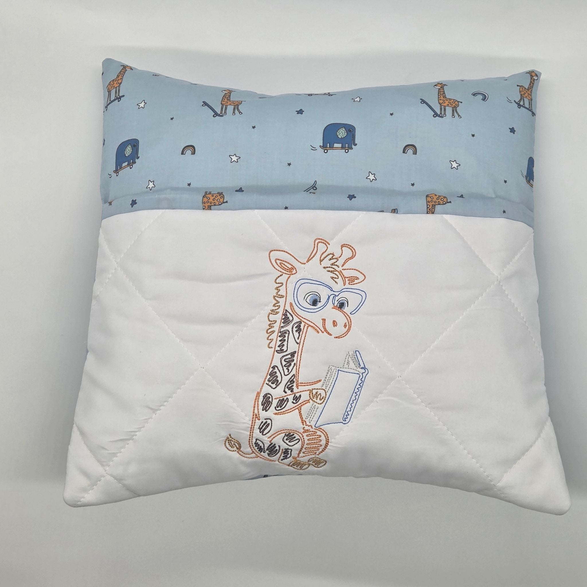 The front and rear of the reading cushion features giraffes and elephants skateboarding on a light blue cotton fabric.