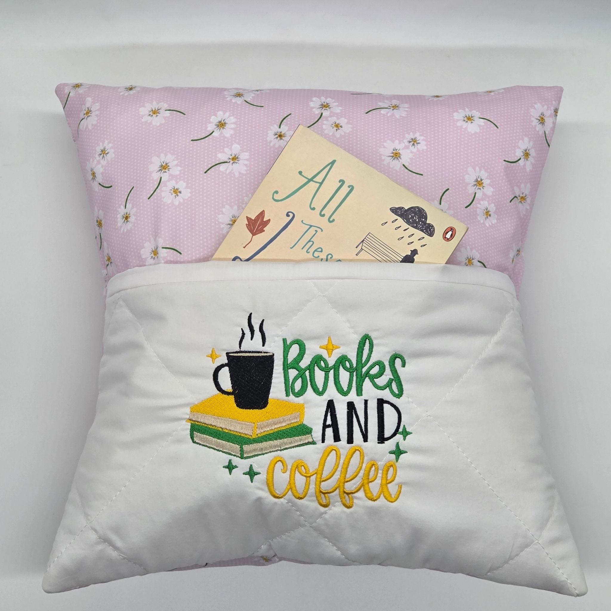 The white quilted book pocket has the embroidered image of a hot cup of coffee sitting on a pile of books next to the words "books and coffee".