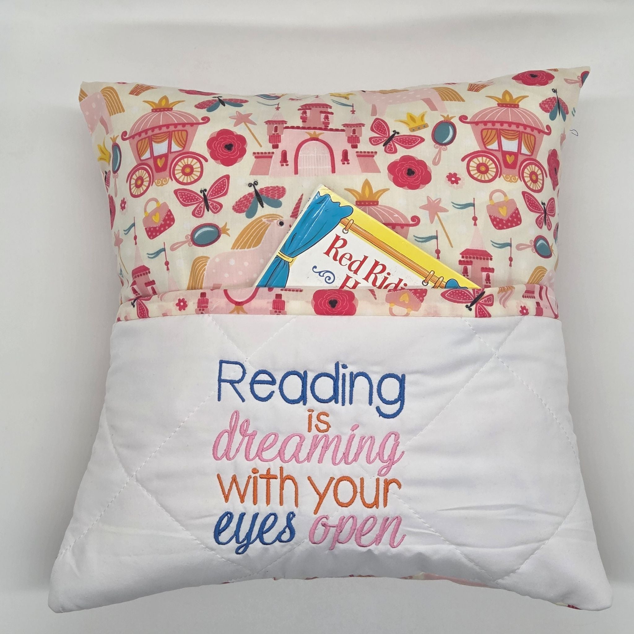 This particular book cushion features a white, quilted book pocket onto which has been embroidered the words "reading is dreaming with your eyes open".