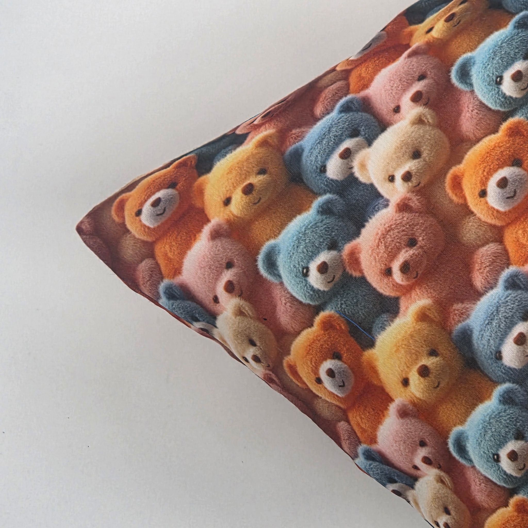 The front of the reading cushion features 3D teddy bears on a cotton fabric.