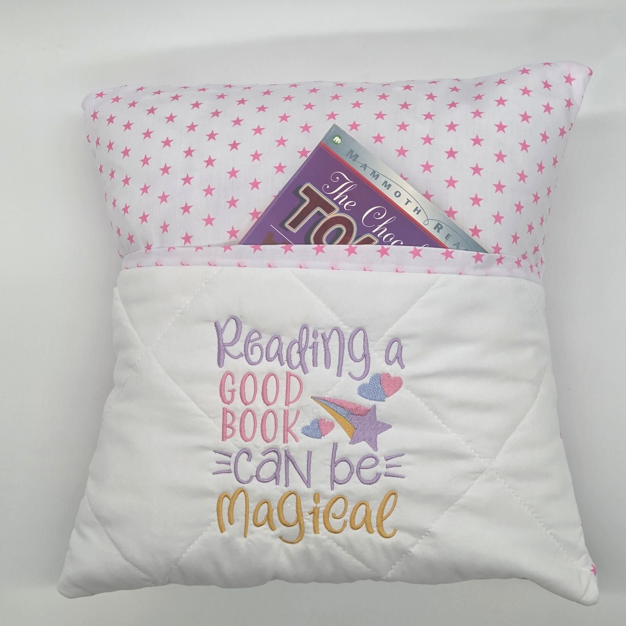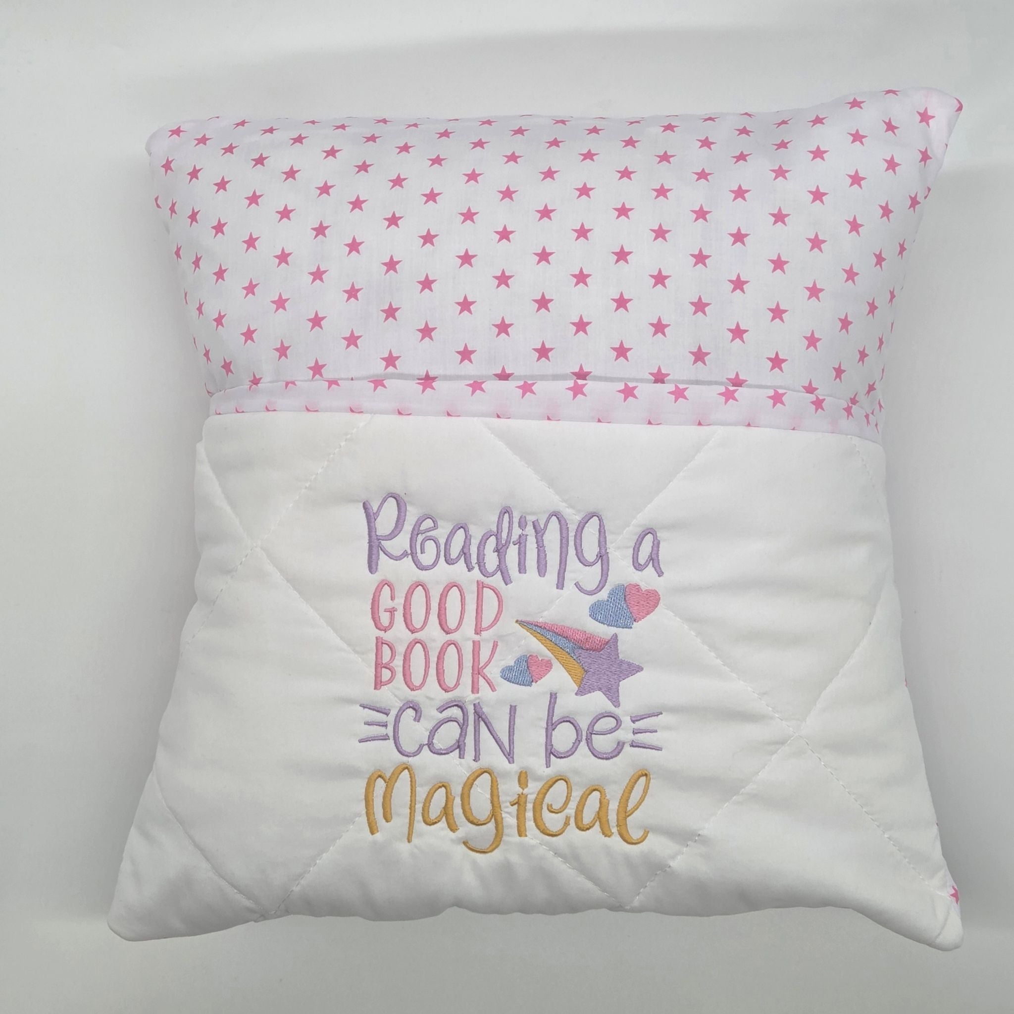 This particular book cushion features a white, quilted book pocket onto which has been embroidered the words "reading a good book can be magical" next to a shooting star.