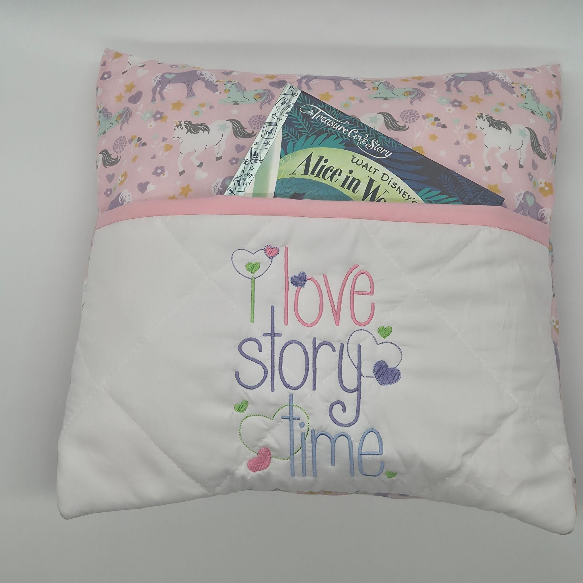 This one features the words "I love story time" embroidered onto the white quilted book pocket.