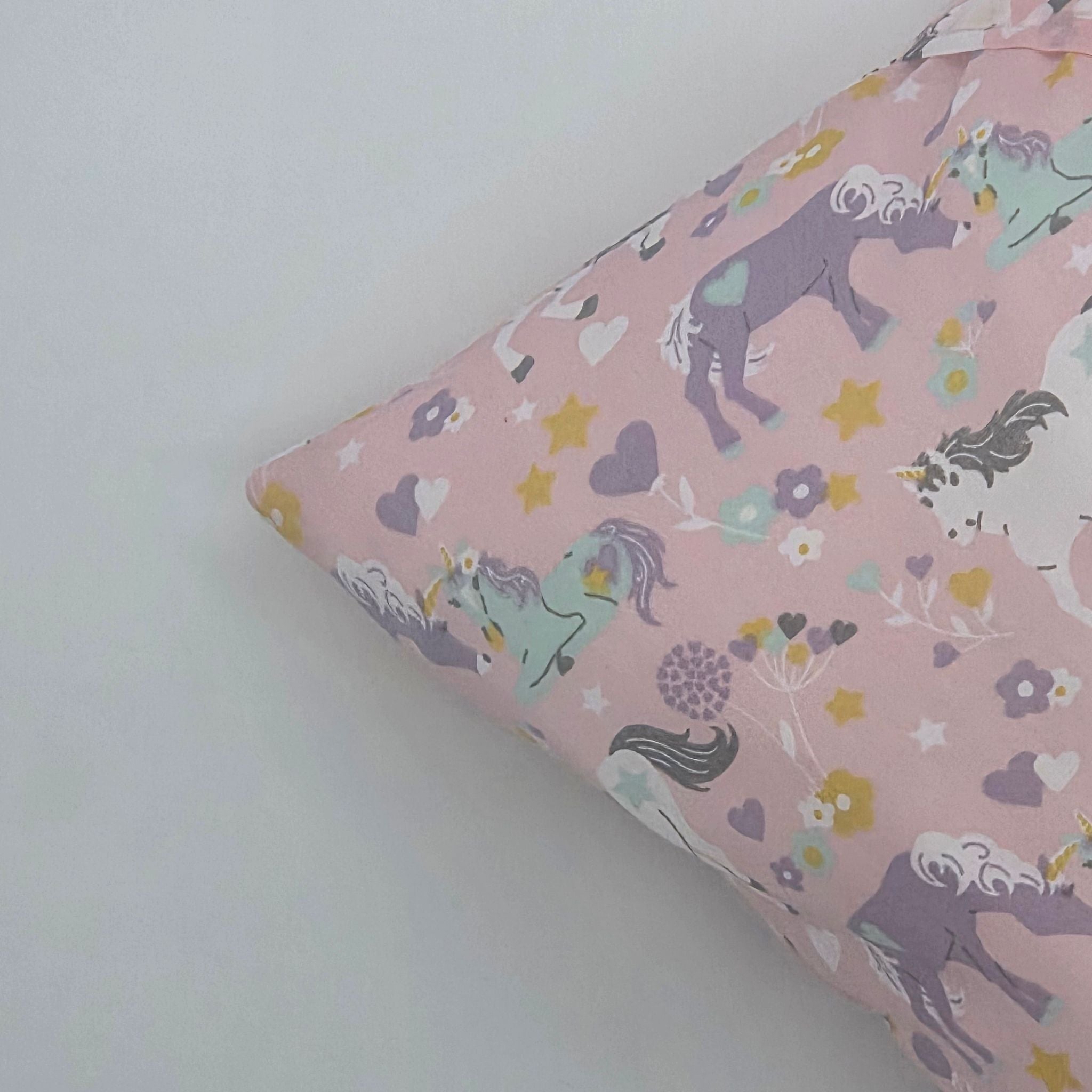 The cushion itself features different coloured unicorns on a pink cotton fabric.