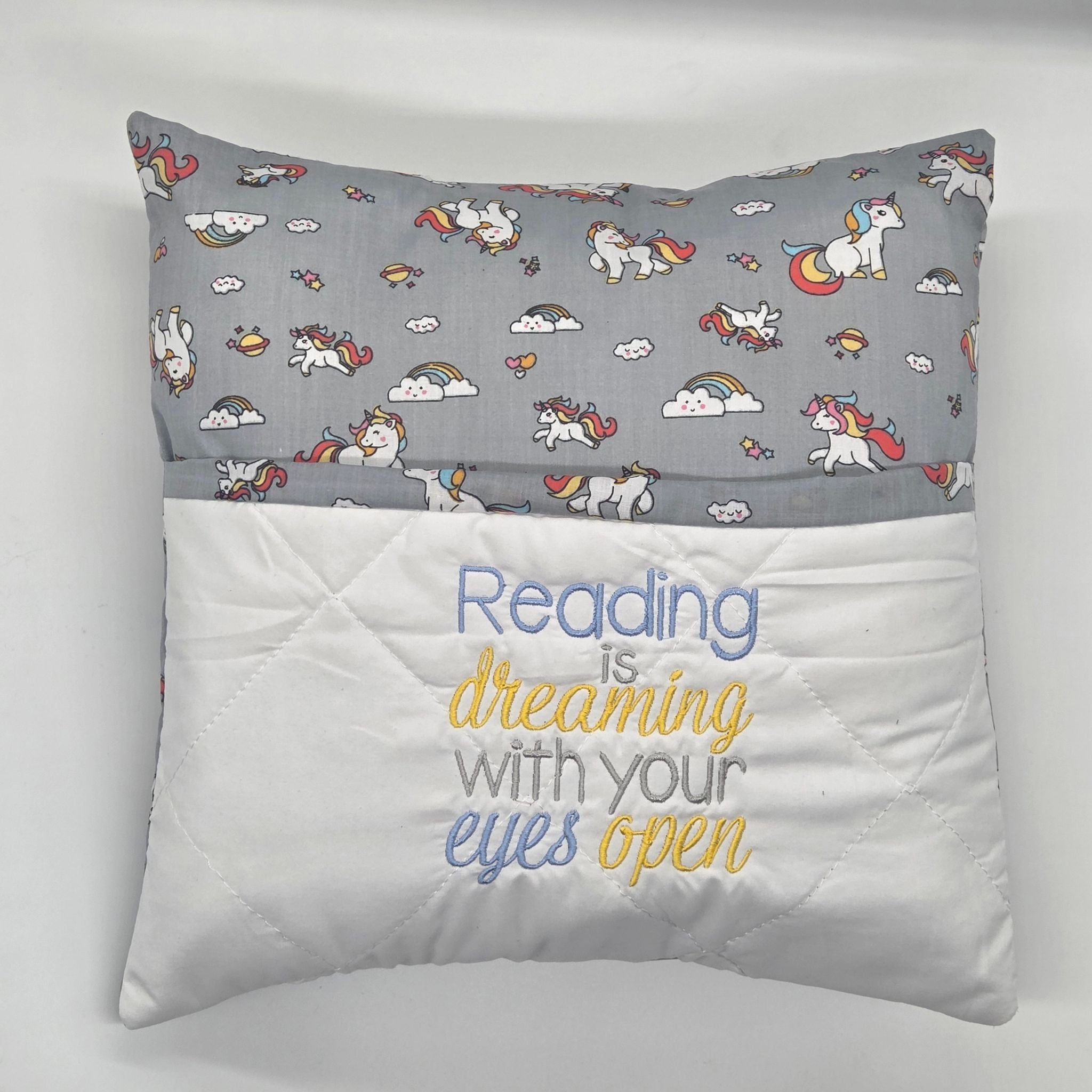 This particular book cushion features a white, quilted book pocket onto which has been embroidered the words "reading is dreaming with your eyes open".