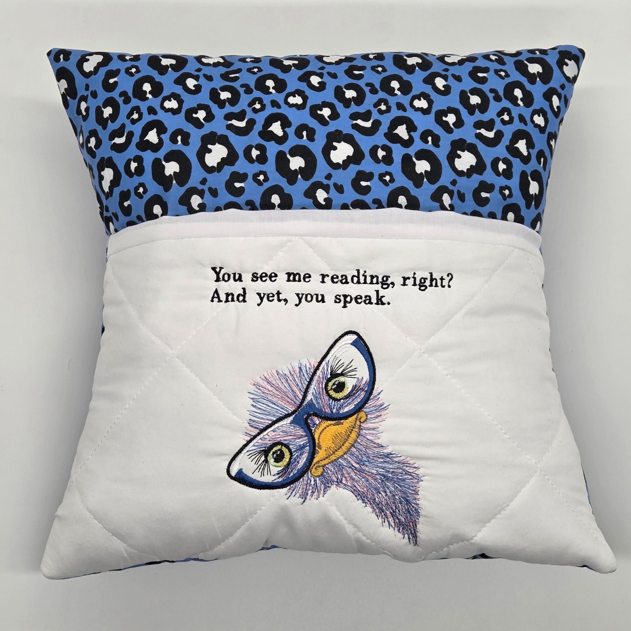 It's entitled "You See Me Reading" and features an embroidered depiction of an annoyed looking ostrich in glasses below the words "you see me reading, right? and yet, you speak" all embroidered onto a white quilted pocket used to store that latest book of any size.