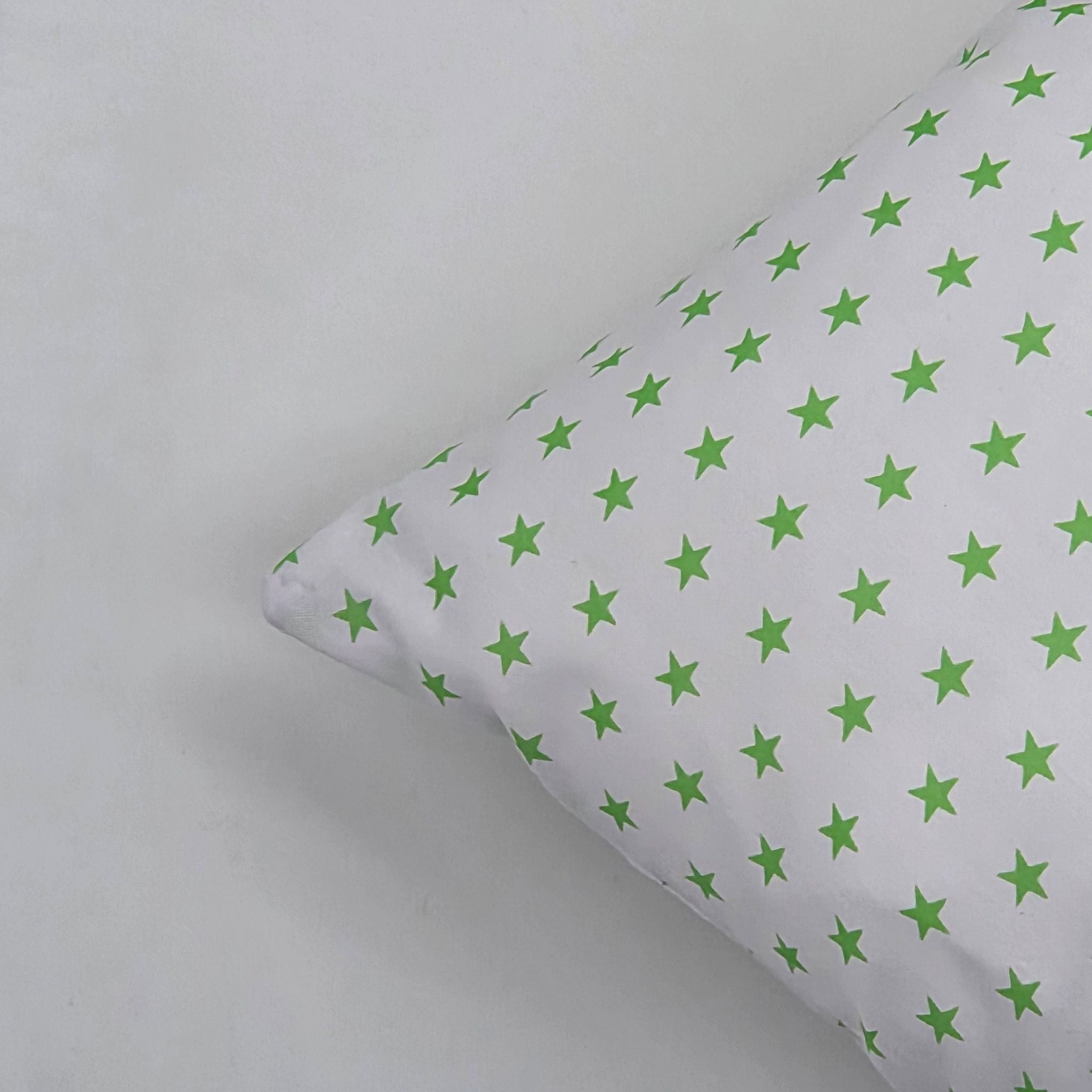 The front and rear of the reading cushion are made from a white cotton fabric with small green stars.