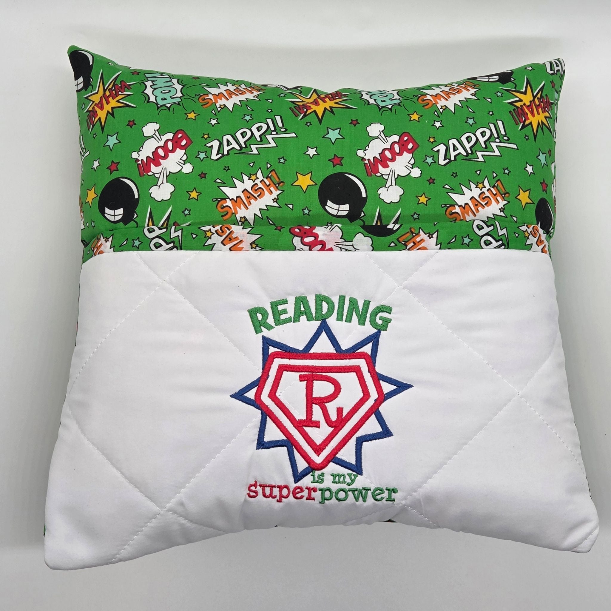 The white quilted book pocket features a hand embroidered superpower badge alongside the words "reading is my superpower".